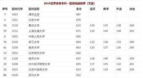 2018年北京大学在北京的理科录取分数为686分,文科的录取分数线为679分。而同年北京大学在安徽省的理科录取分数线为694分,文科录取分数线为664分。而清华大学在北京的理科录取分数为685分,文科为687分。同年清华大学在安徽省的理科分数线为691分,文科录取分数为668分。