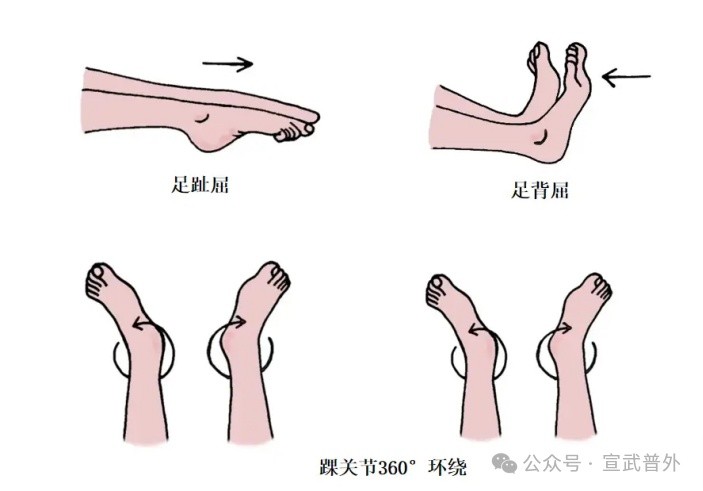 环绕运动:以踝关节为中心,脚趾做360度环绕,尽力保持动作幅度最大,以病人不疲劳、不疼痛为准。