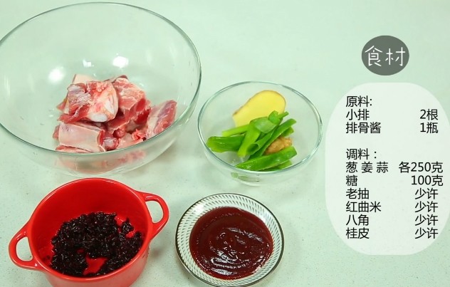 小排:2根排骨酱:1瓶葱:250克姜:250克蒜:250克糖:100克老抽:适量红曲酒:适量八角:适量桂皮:适量