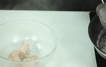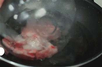 2、排骨放入盛水的锅里,水开后舀出浮沫。
