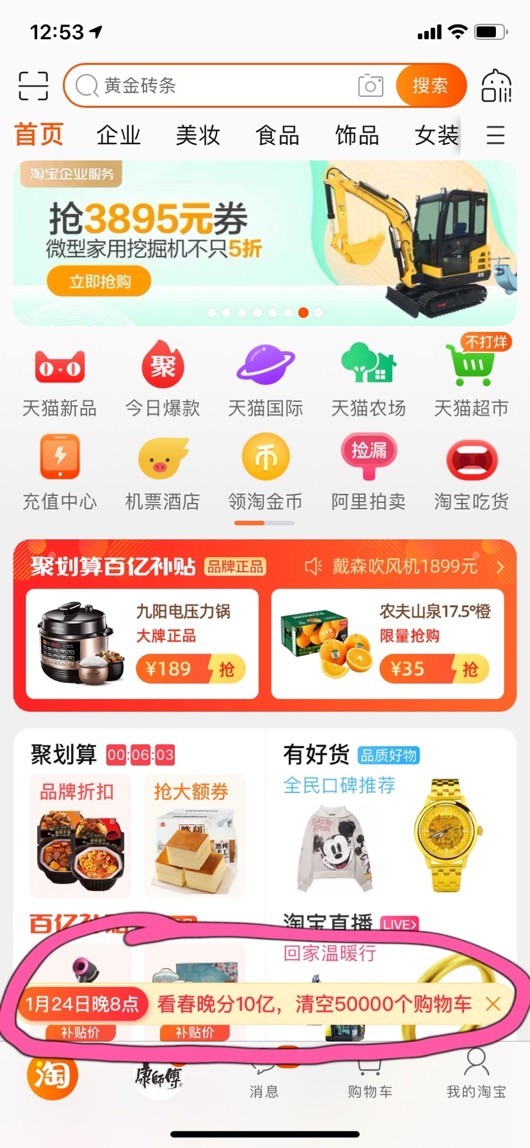 今天,淘宝首页上线了非常重要的一句话:春晚清空5万个购物车