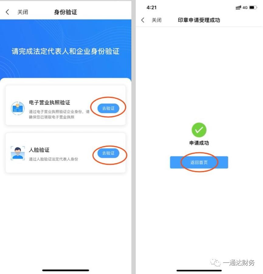 ②点击【申请印章】à选择申请人类型(法人)à点击【一键申请】申请四个企业章à进行法人、企业身份验证à身份验证通过à完成印章申请,返回首页