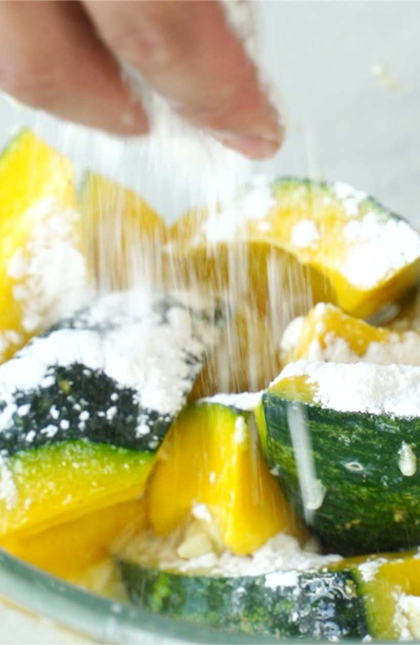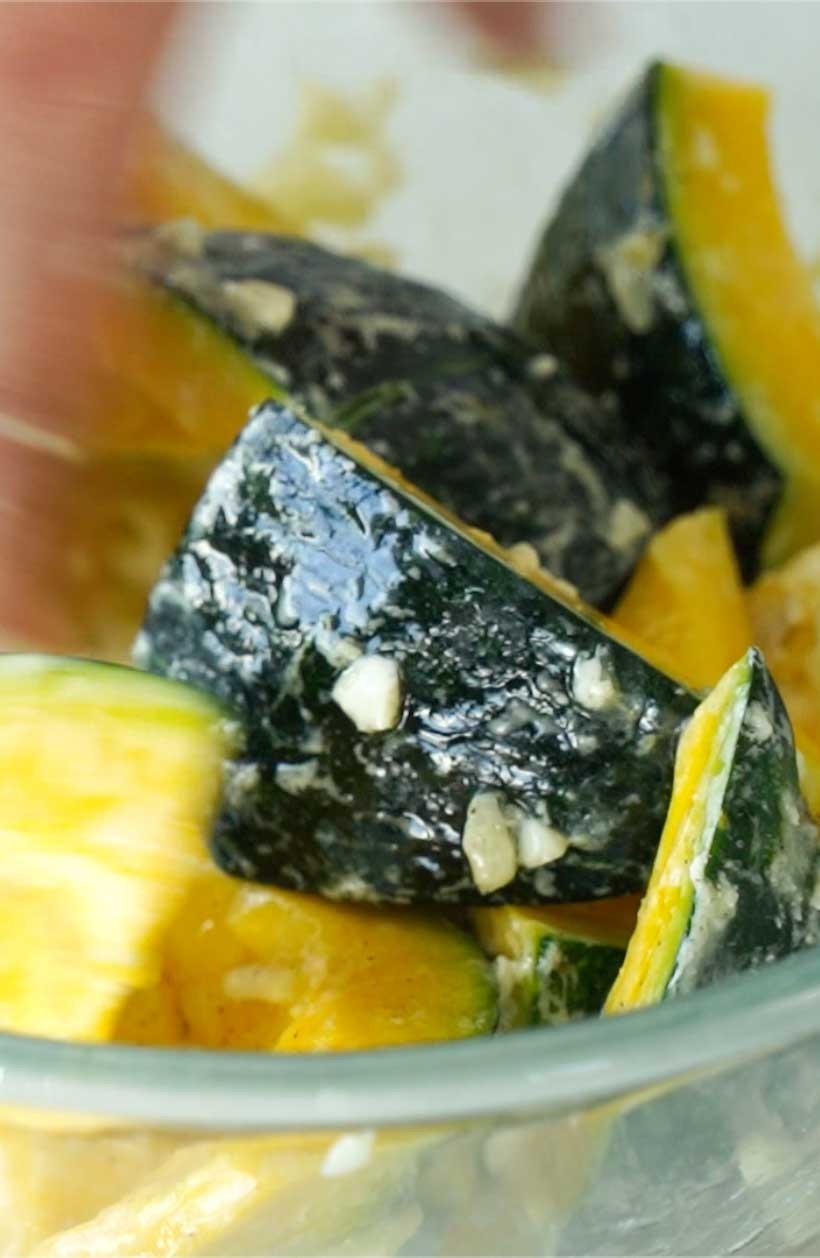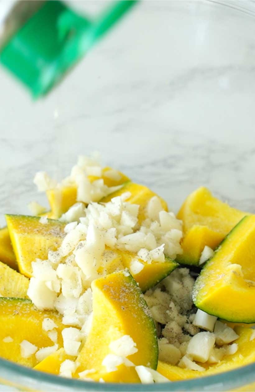 清洗干净的贝贝南瓜,去头去尾去掉中间的瓜瓤,改刀切成小块儿。在切好的南瓜汁中加入蒜粒盐。黑胡椒粉搅拌均匀,再加入适量的油和玉米淀粉,搅拌均匀。