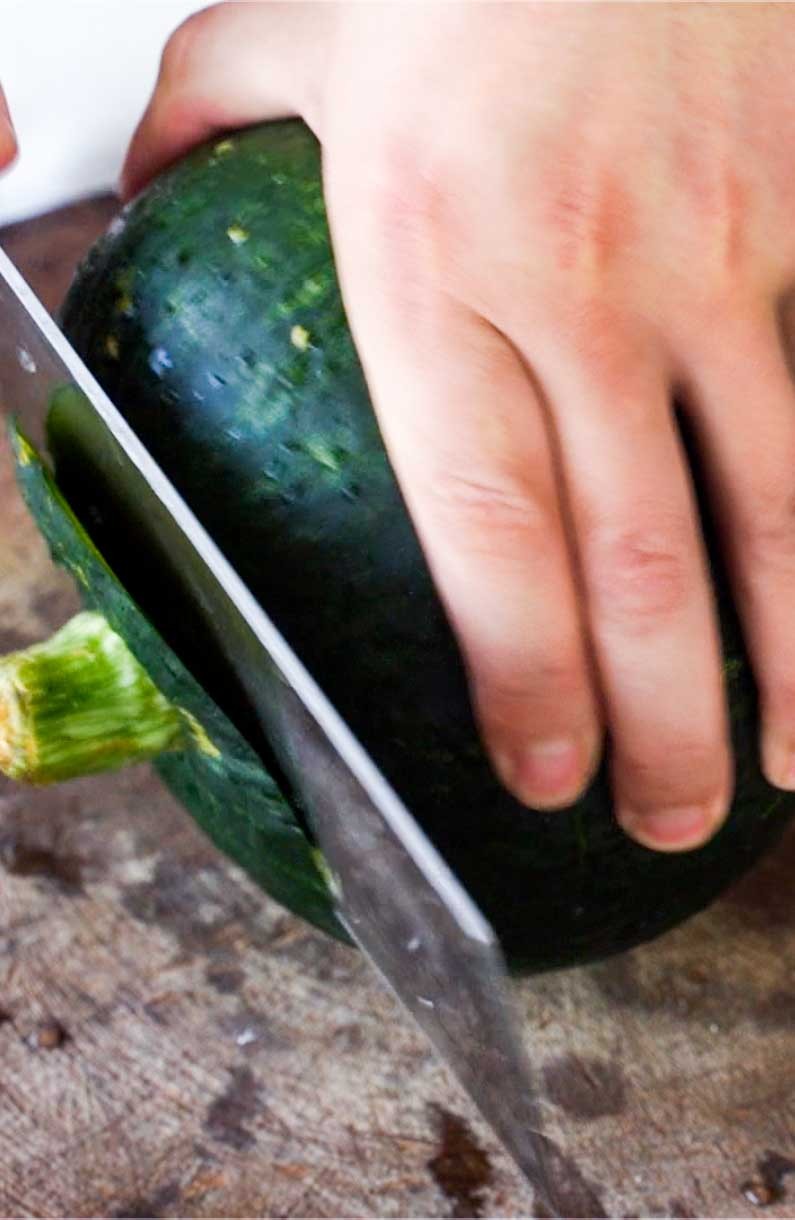 将清洗好的贝贝南瓜放在菜板上,用菜刀将贝贝南瓜的头和尾切掉。