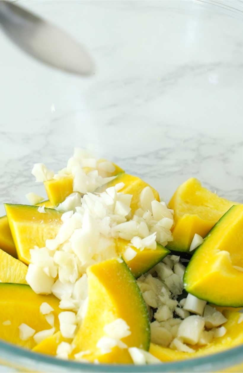 因为这道烤南瓜是蒜香风味,所以我们要准备比较多的蒜粒。这样烤制出来的南瓜蒜香味儿十足。
