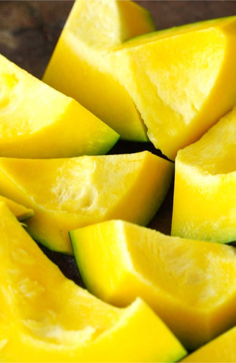然后再将贝贝南瓜切成大小合适的块儿,南瓜的皮不用削掉。将切好的南瓜放进大碗之中。