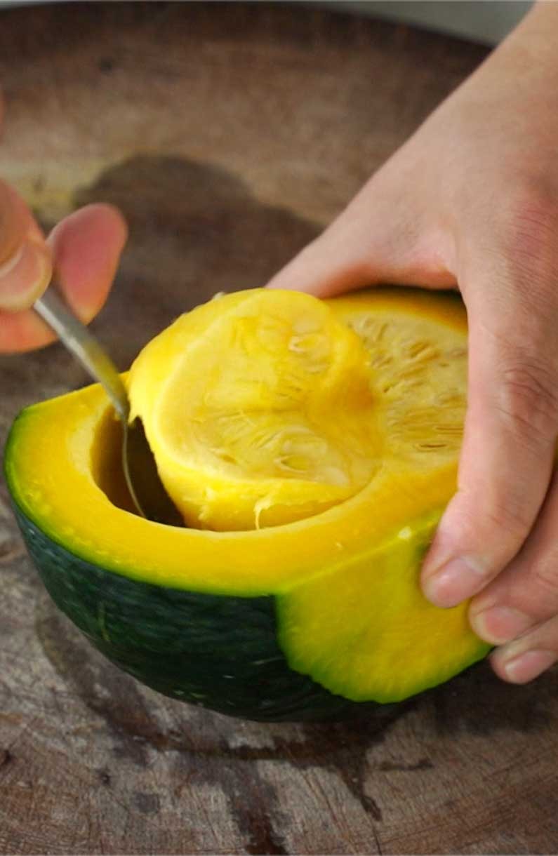 用菜刀把贝贝南瓜一分为二,拿一个勺子去掉瓜瓤。