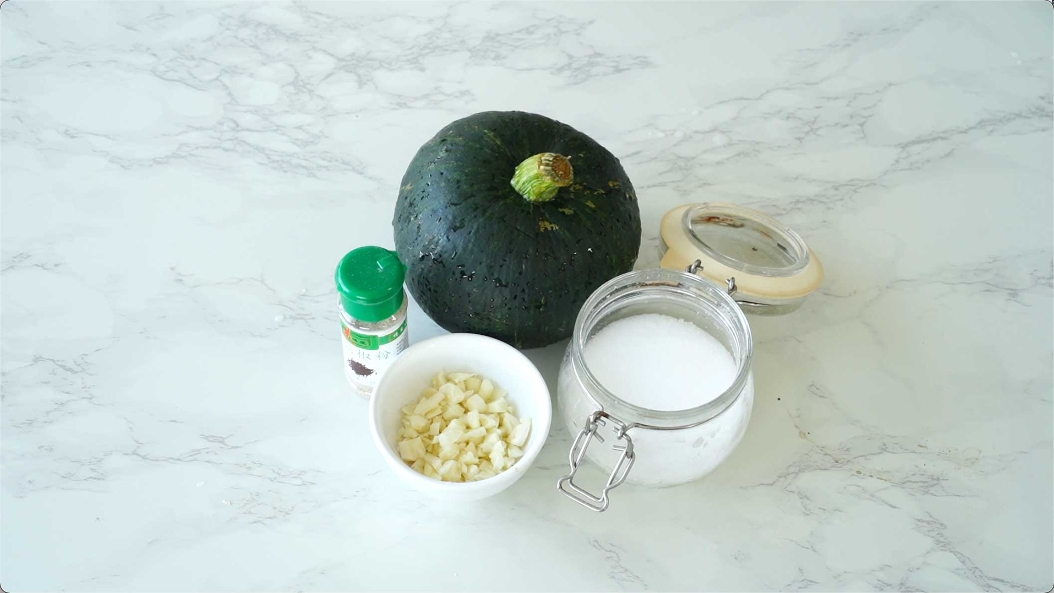 主料:贝贝南瓜一个,蒜粒15g,红椒圈5g