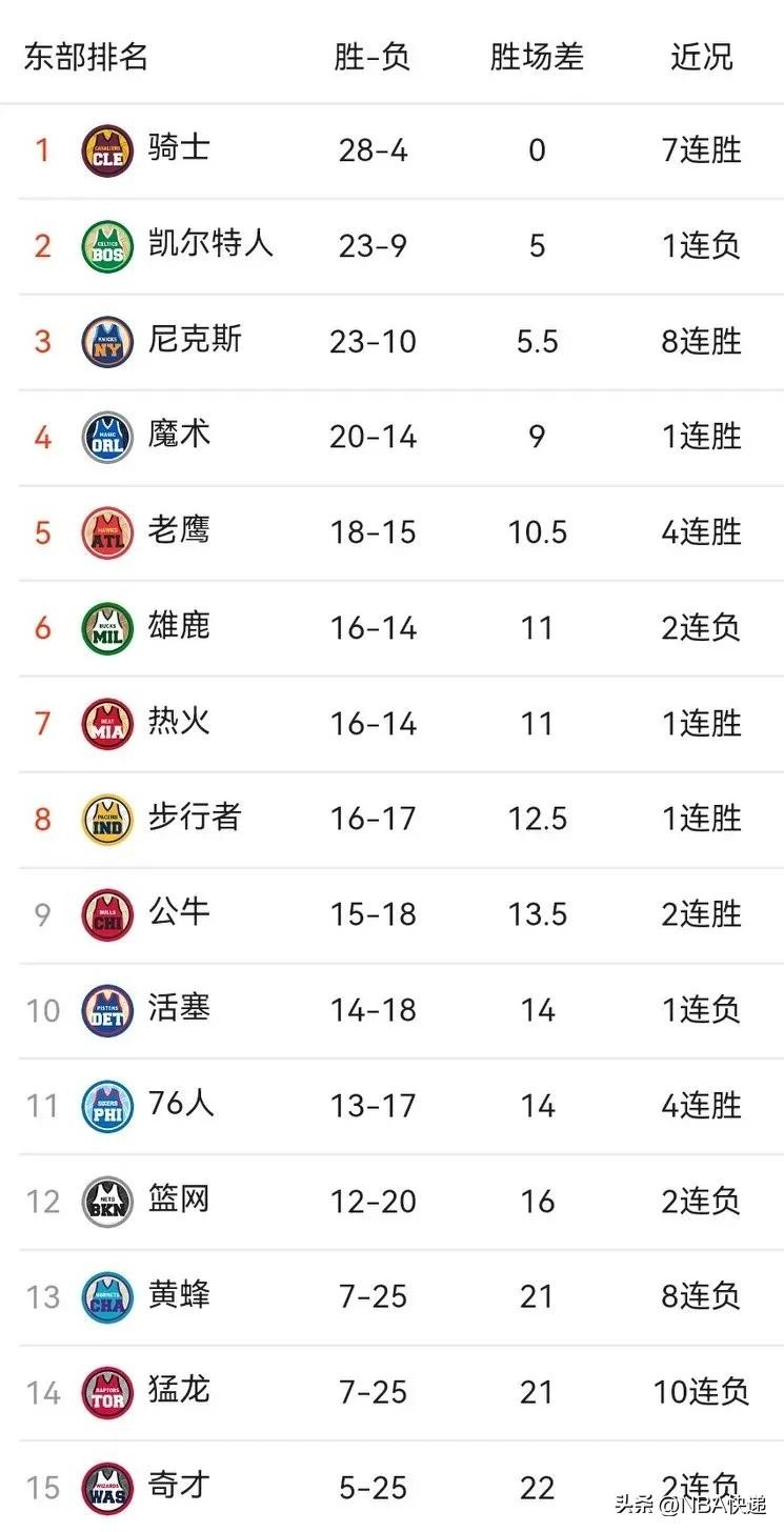 此战后,尼克斯8连胜,战绩23胜10负排名东部第三,距离第二的凯尔特人(23胜9负)只差0.5个胜场,奇才2连败,战绩5胜25负继续排名东部倒数第一。