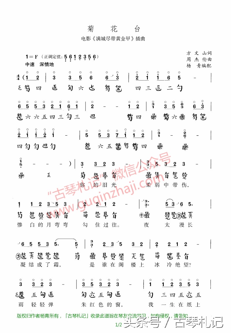 每日一谱丨古琴减字谱《菊花台》 编配:杨青