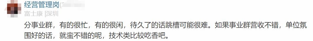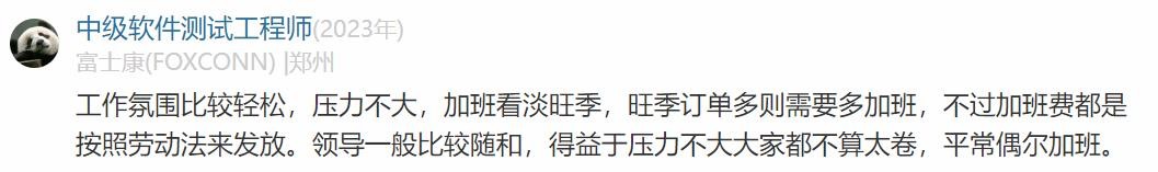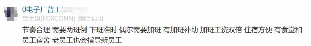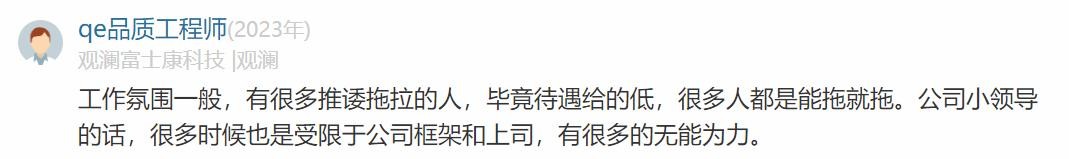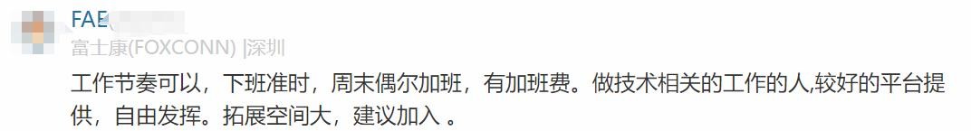 富士康员工原话2:工作氛围一般,有很多推诿拖拉的人,毕竟待遇给的低,很多人都是能拖就拖。公司小领导的话,很多时候也是受限于公司框架和上司,有很多的无能为力。