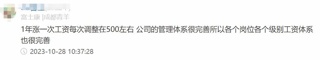 富士康员工原话:基本两三年调一次薪水,涨幅5%-10%,薪酬体系还算可以。大公司人多不好管理会造成人才流失,因此人员等级划分比较分明。