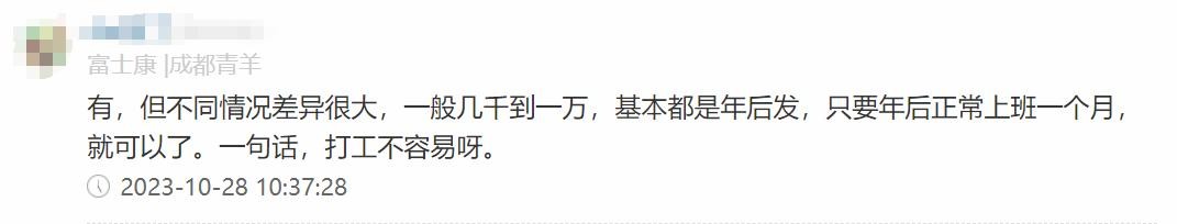 富士康员工原话:有,但不同情况差异很大,一般几千到一万,基本都是年后发,只要年后正常上班一个月,就可以了。