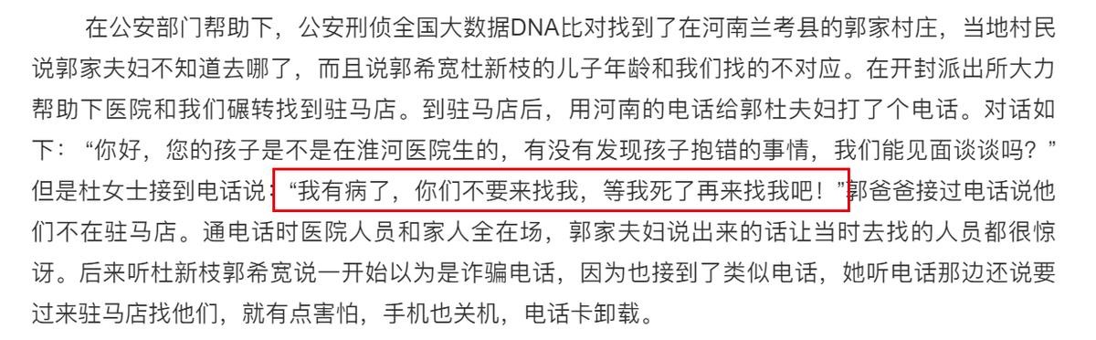可当他们打过去电话询问孩子的出生医院,以及有没有发现孩子抱错的事情时,杜新枝一口拒绝:“我有病了,你们不要来找我,等我死了再来找我吧!”