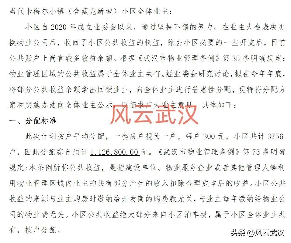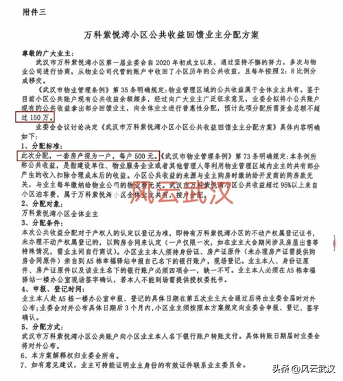 位于光谷花山板块的万科紫悦湾小区,直言小区公共收益余额太多,不得不向向全体业主进行普惠性分配,每户分500元。