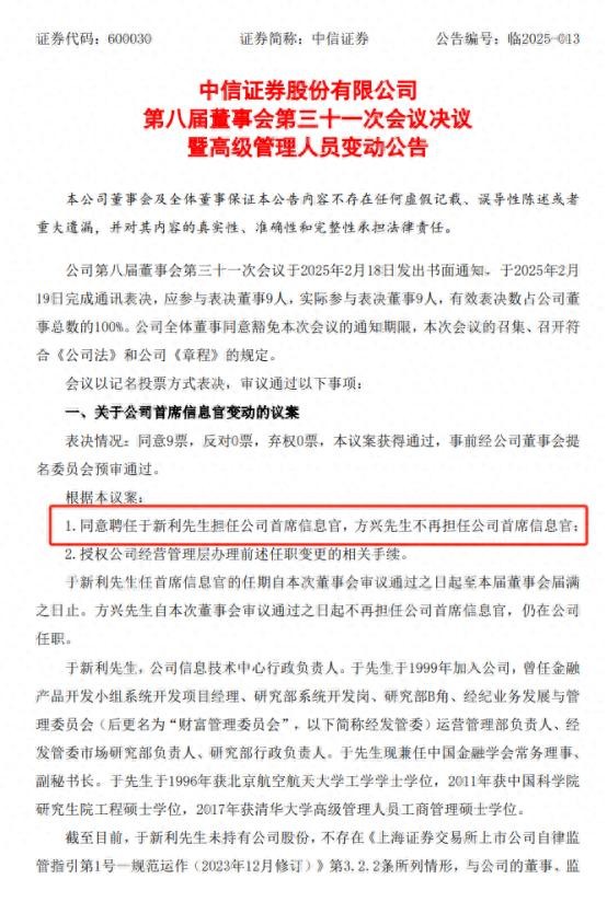 财联社2月19日讯(记者 林坚)以DeepSeek为代表,人工智能大模型的应用正在深刻地改变着证券行业的格局和服务模式,同时,也引起了对券商首席信息官这一职位的高度关注,包括职务变动以及个人战略的风格。2月19日,中信证券公告称,公司董事会同意聘任于新利担任公司首席信息官,方兴不再担任公司首席信息官。