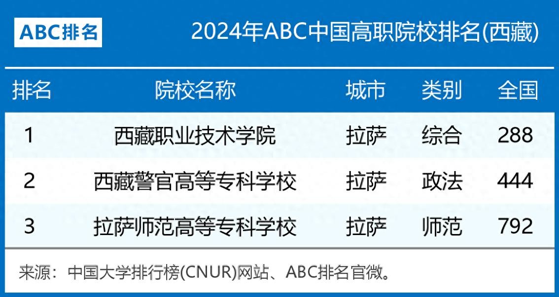2024年ABC中国高职院校排名已正式发布,全国1500余所高职专科院校中前1000所进入榜单,其中西藏自治区上榜3所。