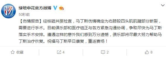 今天中午,马丁斯在队医陪同下前往医院进行了核磁共振。正如之前的预估,结果糟透了。据申花官方介绍,经核磁共振检查,马丁斯伤情确定为右膝股四头肌肌腱部分断裂,需要进行手术。新闻官马悦透露,手术后康复期最快也需要6-7个月。