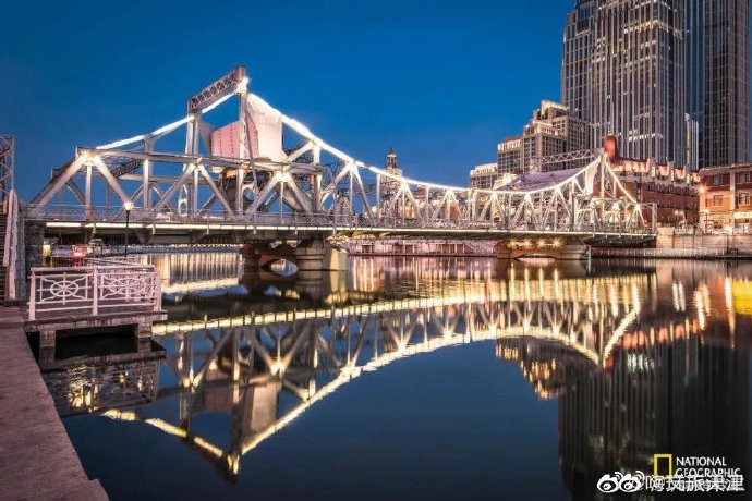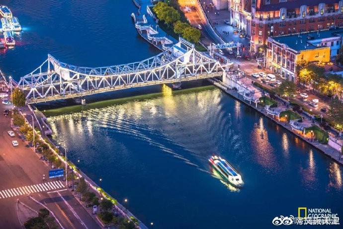 花点心思游津城【这次带你认识 解放桥】解放桥又称万国桥,俗称法国桥、法俄桥,连接着河北区世纪钟广场与和平区的解放北路,因当时的天津有英、法、俄、美、德、日、意、奥、比等9国租界,故得此名。它是海河跨桥中仅剩的三座可开启桥梁之一,合则走车,开则过船,“万国桥下过大船”,曾经是海河一景。图源: 国家地理中文网 via