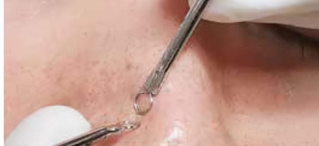 泥膜清洗干净后,我们可以使用粉刺针轻轻刮除皮肤表面冒头的粉刺。需要特别注意的是,使用粉刺针清理切忌大力挤压。