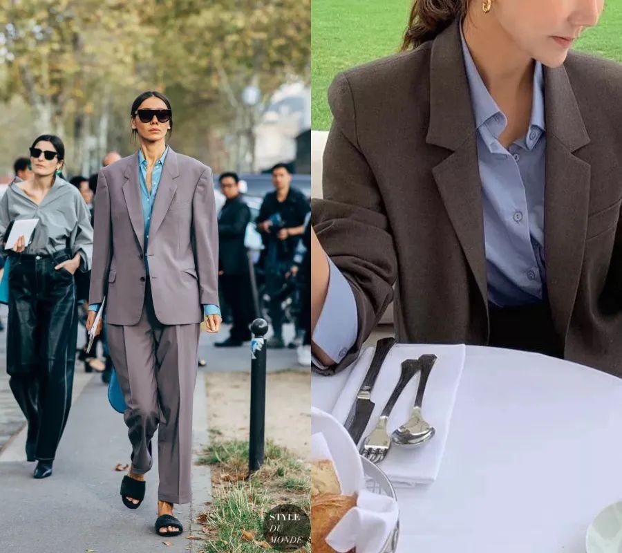 而因为白衬衫比较冷静,所以更推荐oversize一点的西装,这样能够增加整个造型的时髦感,而不会显得硬邦邦的。