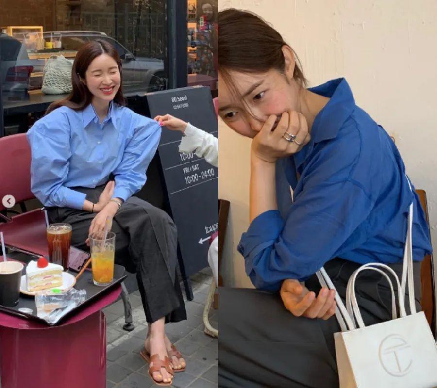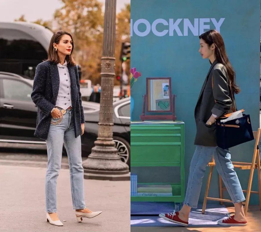 如果是1 : 9的比例,蓝色占比多的时候,整个人就会显得太严肃。加上左边这一身是偏棉麻的材质,还会显得没什么精神。