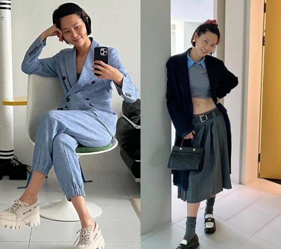 天气很热的南方呢,就可以把里面的短袖换成crop top这种,能够让你增加亮点,也不会显得那么的正经,就有很多时髦精是这么做的。