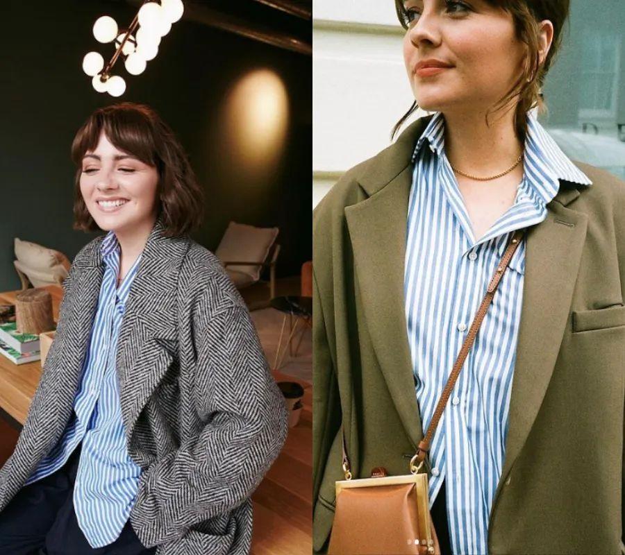 把衬衫换成蓝白条纹的,整个人瞬间就年轻活泼化了。