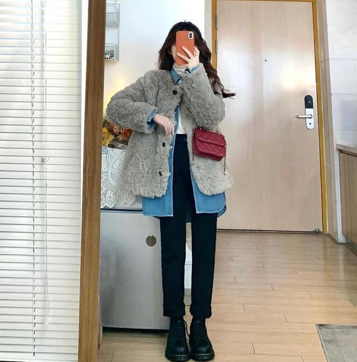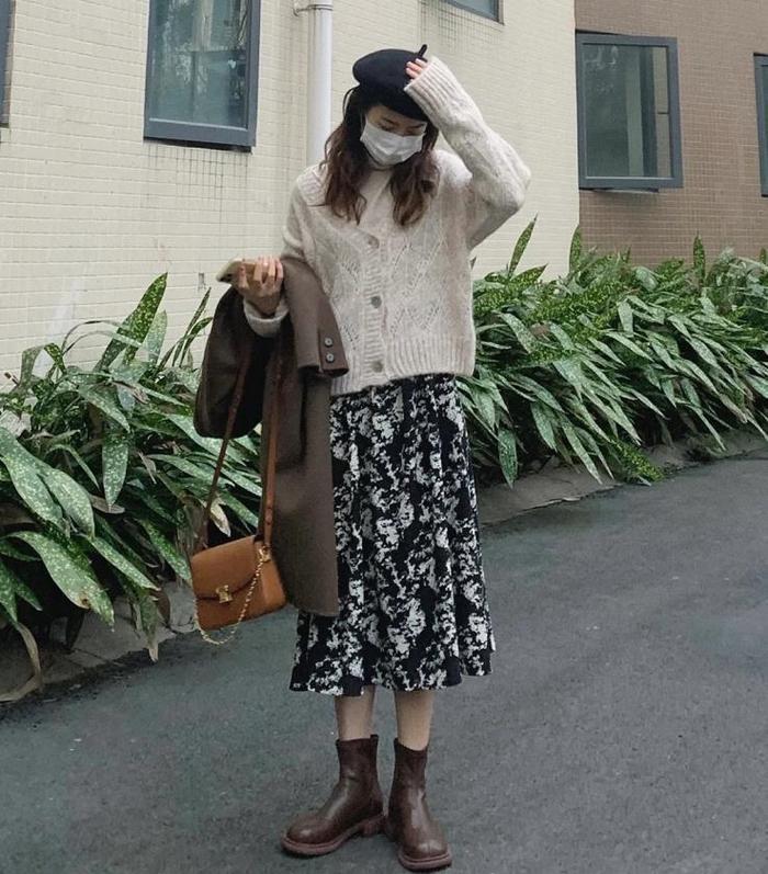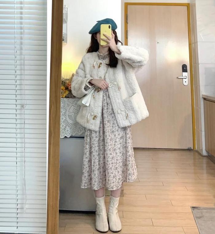 看看这位博主的示范,米色羊羔毛外套,内搭碎花连衣裙,在秋冬季节这样穿,既保证了温度,又不失美感!脚下踩着的奶白色短靴,瞬间让你的造型变得温柔起来。