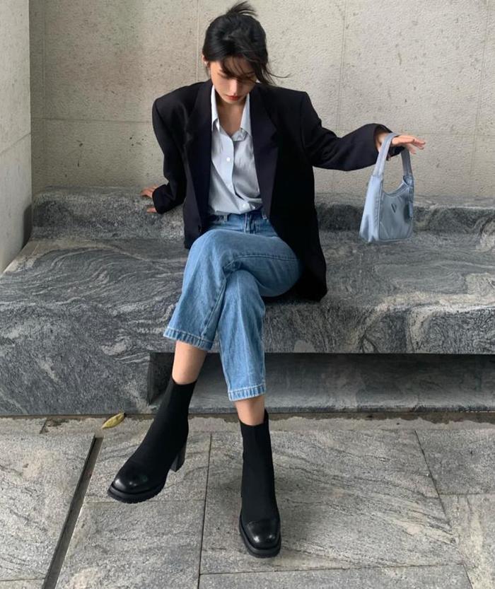 下装选择直筒牛仔裤来配,这种版型的裤子,无论是哪一种腿型都合适,再结合一双奶油色短靴,下身的比例线条就被修饰了,双腿看起来又长又直的,这对于个子矮的女生来说,真的很不错!