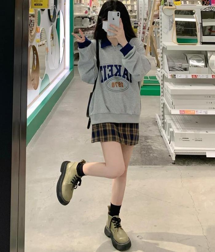 这一套短靴的穿搭,就比较适合在秋天季节穿,卫衣+格纹半身短裙,脚下踩着一双马丁靴,将双腿大部分肌肤露出来,无疑是能够拉长腿部线条的。而且,这样的穿法也很好看时尚,作为身高只有150的小个子,也能轻松驾驭起来!