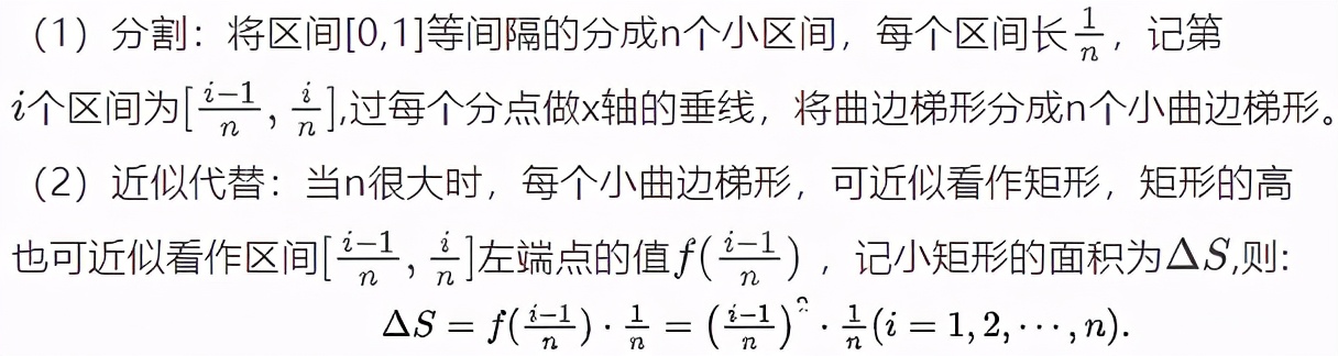 要求解这个曲边梯形的面积,我们可以将区间[0,1]分成许多小区间,把该曲边梯形拆分为许多小曲边梯形,每个小曲边梯形可近似看作矩形,用矩形的面积近似代替小曲边梯形的面积,得到每个小曲边梯形面积的近似值,对这些近似值求和,就得到曲边梯形面积的近似值。可以想象,随着拆分越来越细,近似程度就会越来越好。