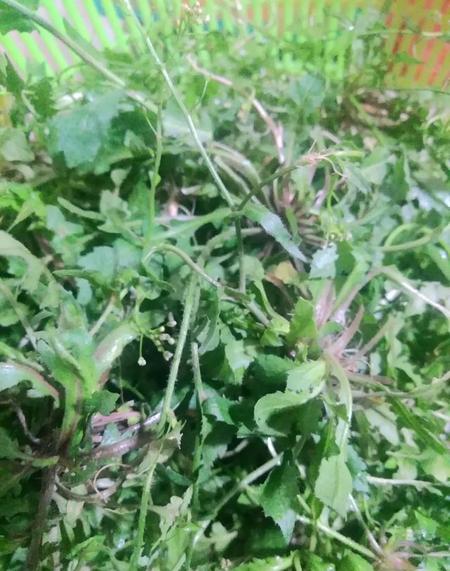 第五种是 荠菜:我们湖南这也叫野菜,齐菜它小的时候很嫩,可以用来做凉拌菜,荠菜做凉拌菜,首先把开摘回来新鲜荠菜洗干净备用,然后用滚烫的开水烫一下,再放冷水里面泡一下,拿出挤干水份,齐菜变得绿油油,是碧绿色的,真的看着就好有食欲!然后再荠菜加入少许辣椒粉、生抽、味精、蚝油、最后加入香葱碎挍拌均匀即可!