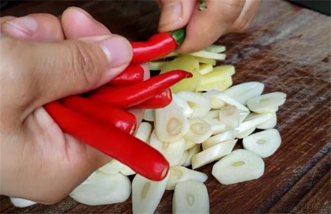 6.大蒜切成薄片,生姜也切成薄片,小米辣直接去蒂,所有配菜一定要提前清洗好,晾干水分。