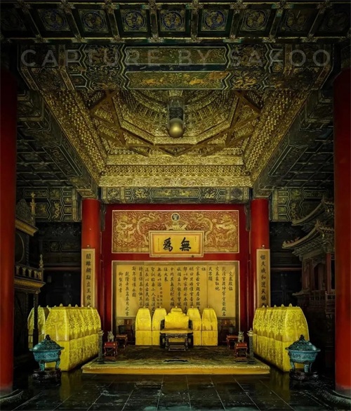 交泰殿内正中悬挂有“无为”匾额,“无为”出自于康熙皇帝御笔,这两个字的意思是告诫自己和子孙“不施刑罚,以德政感化人民,而达到天下大治”的意思。交泰殿内设有皇后的宝座,东侧是铜壶滴漏,是古代的一种计时器,我们现在看到的这个铜壶滴漏是乾隆年间的。西侧是大自鸣钟,是嘉庆年间造办处自制的。宝座前还有25座立匣,是放置玉玺的容器,玉玺是皇帝的印章,是国家权力的象征,25块是为了以应天数,天数即是阳数,1、3、5、7、9之和为25,平时这25颗玉玺的使用都有着严格的规定,每个印玺都有着不同的作用。