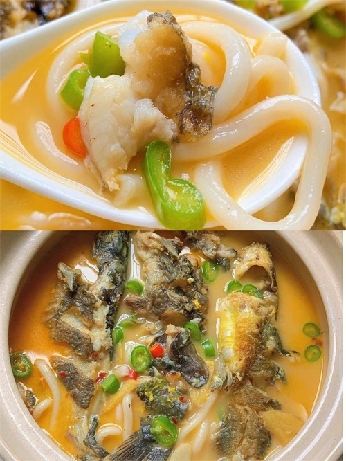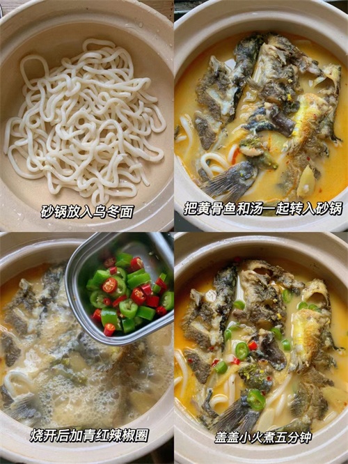 ️3、砂锅铺上乌冬面倒入鱼和汤,放青红辣椒圈盖盖再煮五分钟即可。