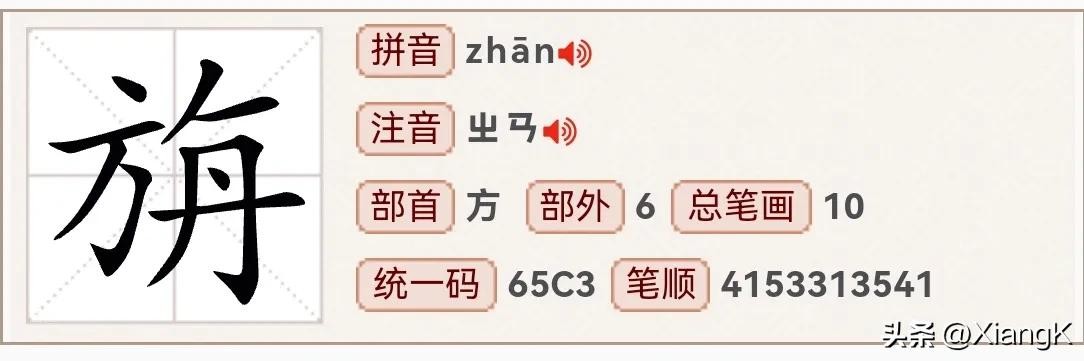 读音为“zhān”,同音字“瞻”,部首为“方”,总笔画10,左右结构。
