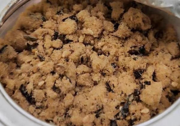 而添加熟豆粉的肉粉松颜色往往是里面较浅白,外面颜色较重,可以明显看到粉状物,手一捏就粘在一起。