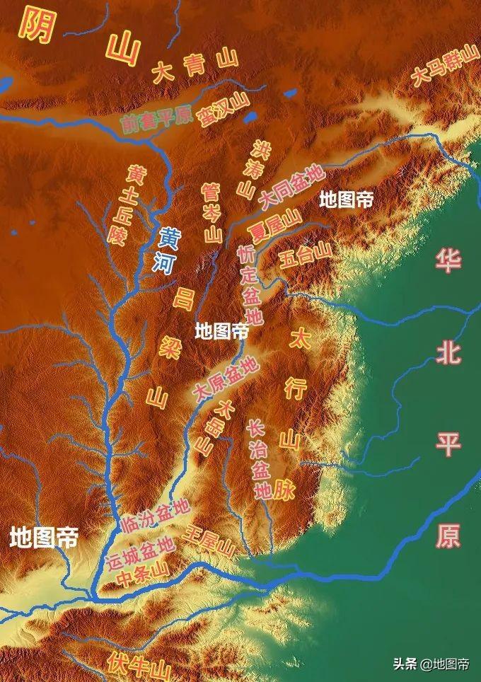 山西省是个山地高原省份,全省基本处在黄土高原的东翼,大部分地区的平均海拔都在1000米以上。在全省面积中,80%是山地和丘陵,剩下的20%多是盆地(含台地)。山西地形一个非常显著的特点,就是盆地较多,而且山西的盆地差不多呈一条线,从北至南狭长分布。另外就是,每一条狭长的盆地基本上都会流经一条大河。