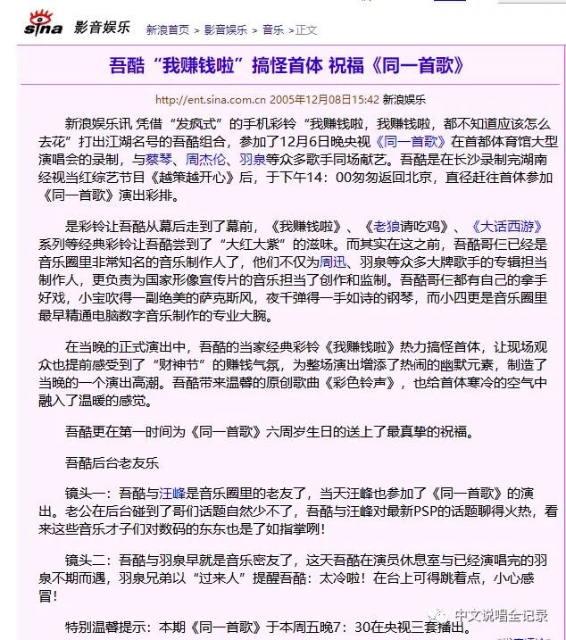 这首歌是几个大学生创作的,他们叫“吾酷”。当时还上过央视采访,以及多个大型晚会与综艺节目。同时,他们也靠这首歌的彩铃下载业务,狠狠赚了一波。看看下面这条2005年的新浪新闻,你就知道他们当年有多火了。