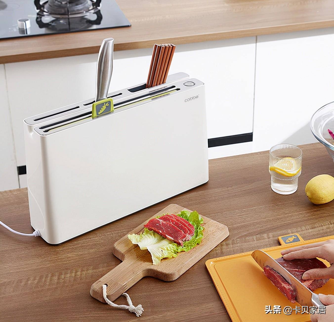 卡贝消毒刀架,从外观来看,纤细瘦长的长方体造型,机身上下除了卡贝logo以外没有任何装饰,这种纯白极简风时尚百搭,没有传统刀架那种“老土”的感觉,放在厨房里天然就是一个好看的装饰品。