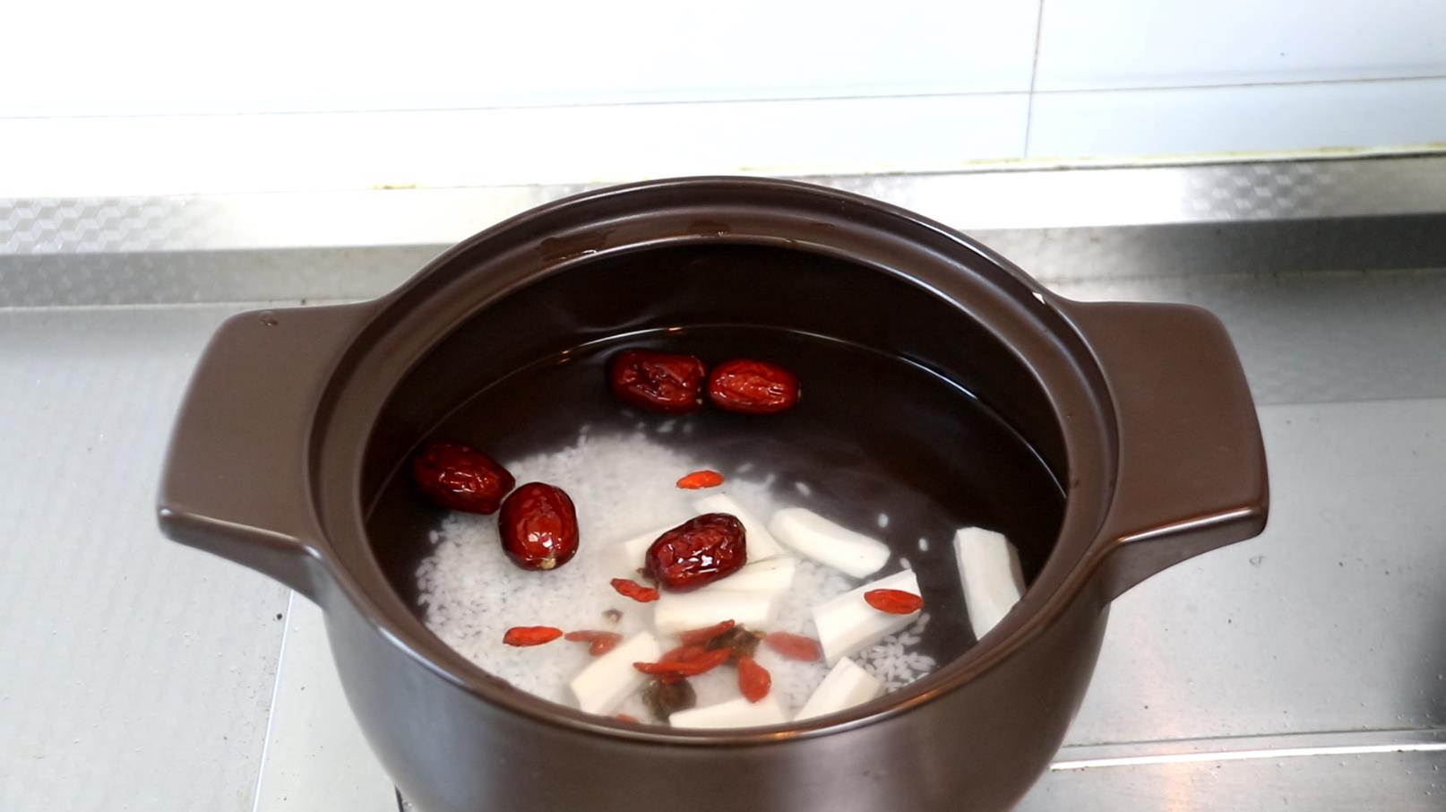 第一:把铁棍山药去皮切段,大米提前泡开,红枣去核,枸杞子泡一下。砂锅中准备3斤水,把5款食材一起倒入砂锅中,大火烧开之后改成小火煲35分钟。
