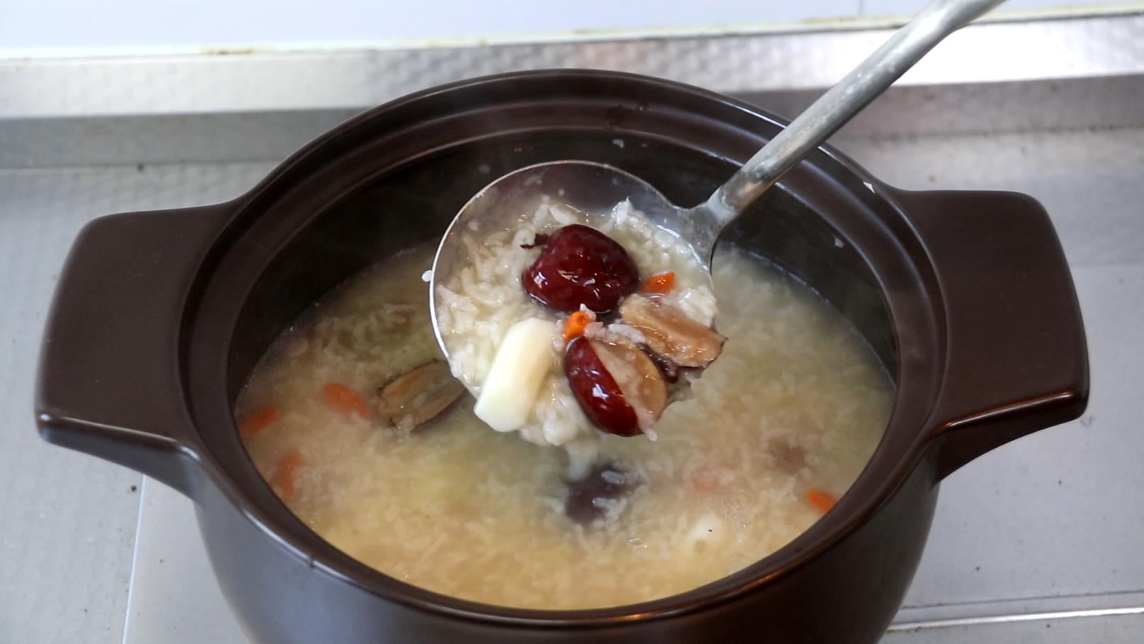 第三:现在这款粥就煲好了,稍微晾一下就可以盛出来了。这款粥我们加的有红枣、桂圆和枸杞子,味道甜甜的,大人孩子都比较适合。有需要的朋友不妨在家煲一下这款粥。