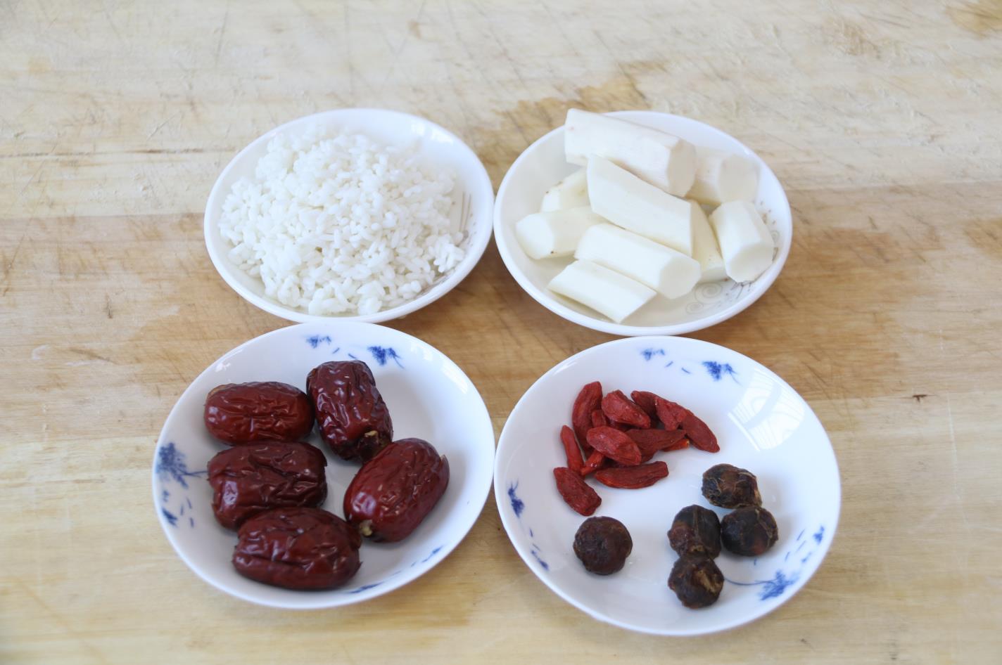 选择食材:铁棍山药80克,大米70克,红枣5颗,枸杞子15粒,桂圆肉5粒备用。