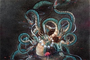 相柳,长着人面蛇身,九个脑袋,身形巨大,可同时盘踞九座山头,一口就可吃下所有山上的东西,十分恐怖。