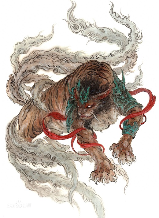 他有着人的面孔,但长着老虎的身子,有八个头,八只,腿八条尾巴,是一只体型巨大的神兽。