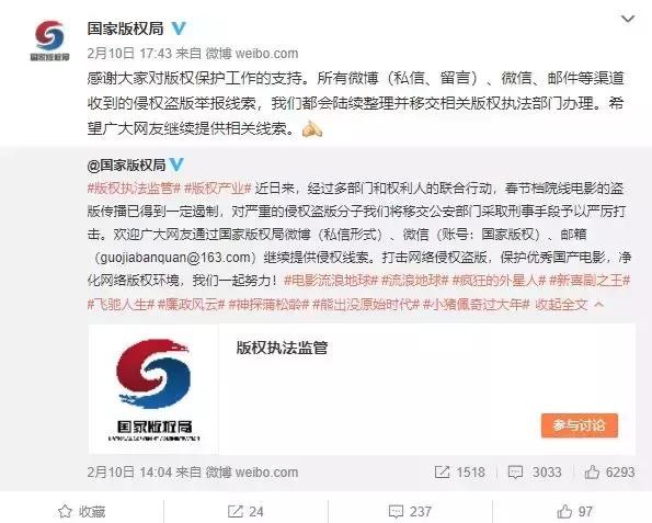 2月10日,国家版权局发布声明,表示将严厉打击网络侵权盗版,保护优秀国产电影,对严重的侵权盗版分子我们将移交公安部门采取刑事手段予以严厉打击。