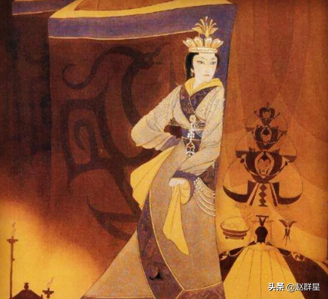 此后,萧观音“侍君疆廓八千里,雪野苍苍连草明。”在萧皇后伴随下,辽的疆域扩展了,雪野辽阔,一片苍茫,碧草连天,翠明旺盛。诗人通过写辽地的壮阔和生机,从而写出了大辽江山出现的鼎盛的局面。萧皇后自然功不可没。“ 医巫闾峰栖霞媚,千秋桥影掠惊鸿。”用对偶的修辞对萧观音致以高度的赞誉,把她比作“霞媚”和“惊鸿”,说明她随着辽道宗居山过桥,留下了霞一样妩媚的倩影和大雁一样轻盈飘逸的姿态。两个比喻精巧美丽。“医巫闾峰”,辽代名山;“千秋桥”,辽中京土河上的一座有名的长桥。名山衬美娇,名桥显贵人啊!句式整齐,形象动人。“瀚漠遥遥路不尽,毡帐对酒指若葱”说明萧皇后还陪着辽道宗过沙漠,住毡帐。不怕路远,不惧酒烈。写出了萧皇后和辽道宗相影相随,情深意切的幸福时光,以及他们对社稷的共同努力。“躬行披沥兴国是,丹心一片贯太清。”中“国是”指国家决策、规划等重大事务。说明萧观音一直参与政治活动,是辽道宗政治上的帮手。“太清”指天空。这两句诗是对萧皇后的高度赞扬:她为了国家,呕心沥血,事必躬亲,一腔赤诚,一片丹心,苍天可鉴啊!从“伴君”的情节中,我们能够感受到萧观音还富有卓越的政治才华和强烈的报国热情,也能够感受到辽道宗对她的爱恋和专宠。这个期间,她为辽道宗生下了一男三女。长子耶律浚,后来被册封为太子。萧皇后与辽道宗这段时期深厚的感情带给了萧皇后一段最美好的岁月。但是,好景不长,“天子恣情极声色,轻文淡武好喜功。百场弥猎千多日,金殿萧萧荆杞生。”道宗在位既久,纵情色欲,肆意射猎,“金殿萧萧”写出了辽道宗怠于朝政,使金殿出现了萧条冷落的局面。“荆杞”本指草木、枸杞之类。这里比喻因为朝政的疏荒而产生了祸国殃民的奸臣的窘迫现象。为萧皇后被害做铺垫。“白山黑水乌云劲,朝野纷纷现枭雄。”中的“乌云”比喻朝野上下一片黑暗,将要出现暴风雨的现状。“枭雄”在这里是褒词贬用,指那些乘着政治的黑暗,采用不正当的手段成为“英雄”的奸臣。