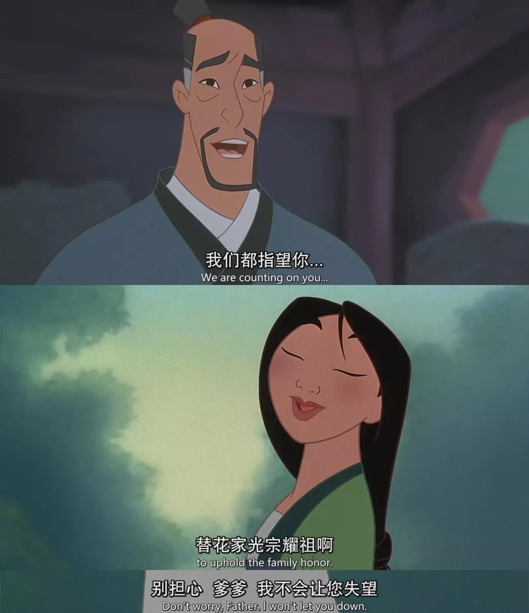 电影中,花木兰通过对着镜子中的自己说道:“我代替父亲去军队,也不完全是为了我的父亲,而是希望将来有一天我可以成为一个女英雄,可以实现自身的价值。”