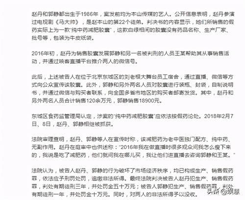 上一次看到有关郭静的消息还是2019年,当时有媒体报道称本山传媒旗下艺人“胖丫”赵丹和郭静,因犯生产、销售假药罪,被北京市东城法院分别判处有期徒刑三年和一年。